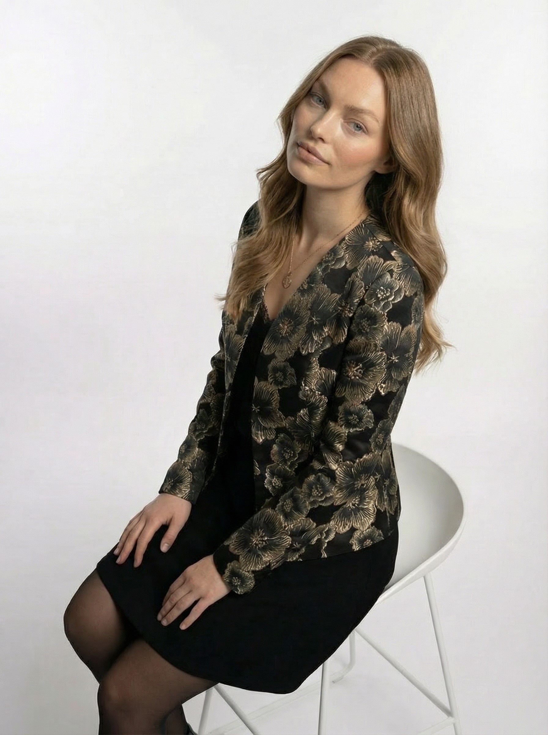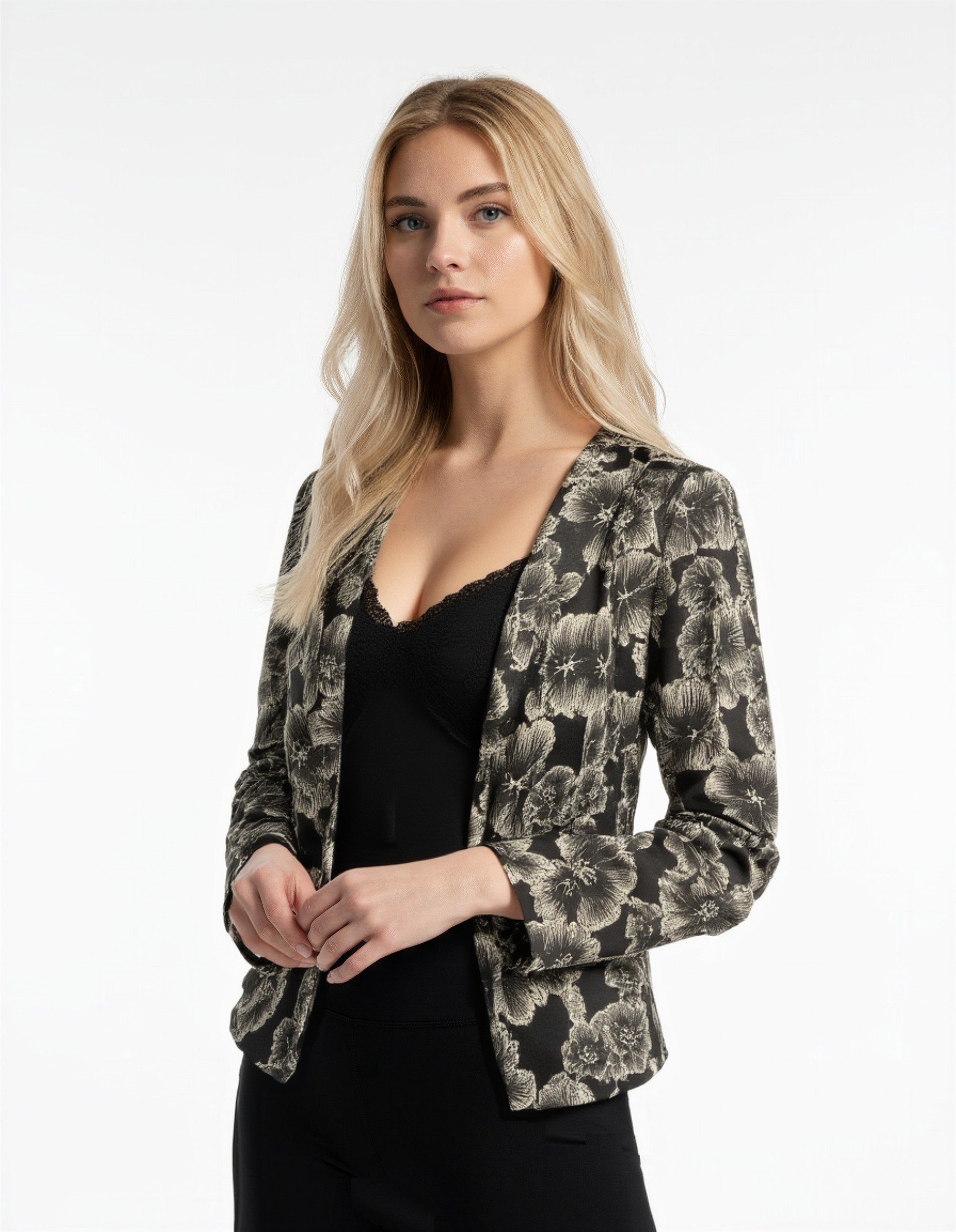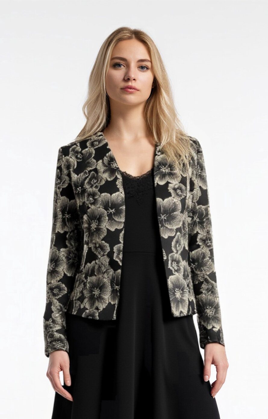 Jaki avatud esiosa loob kerge ja voolava silueti, mida on lihtne kombineerida kleidi, pluusi või toppidega. Tumedal põhjal elegantne lillemuster lisab naiselikkust ja luksuslikku tunnet, säilitades samas Prottenile omase minimalistliku joone.